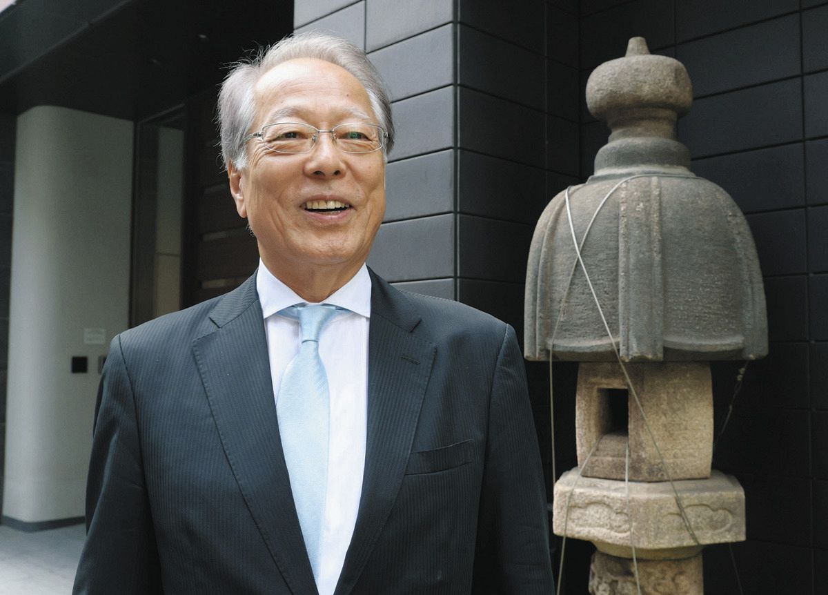日本橋に根付いた経営について話す工藤哲夫さん。右は旅館時代から置かれていた石灯籠=東京都中央区日本橋本町で
