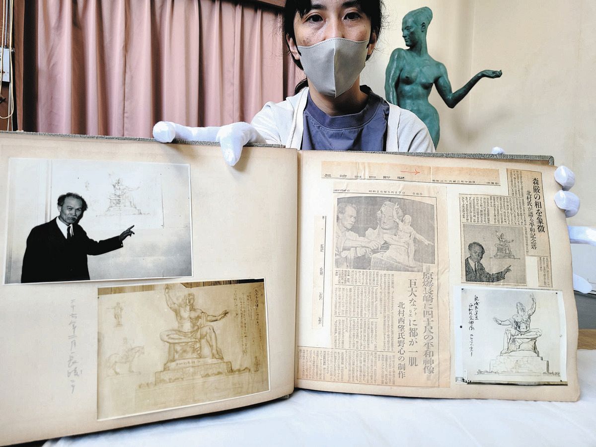 財団によると、北村は1950年に長崎市から記念碑制作を依頼され、北区内の自宅兼アトリエで構想を練り始めた。見つかった資料のうちスクラップブックは表紙に「平和像(1)」とあり、1950~53年のスケッチや試作像の写真、新聞記事などを収めている。