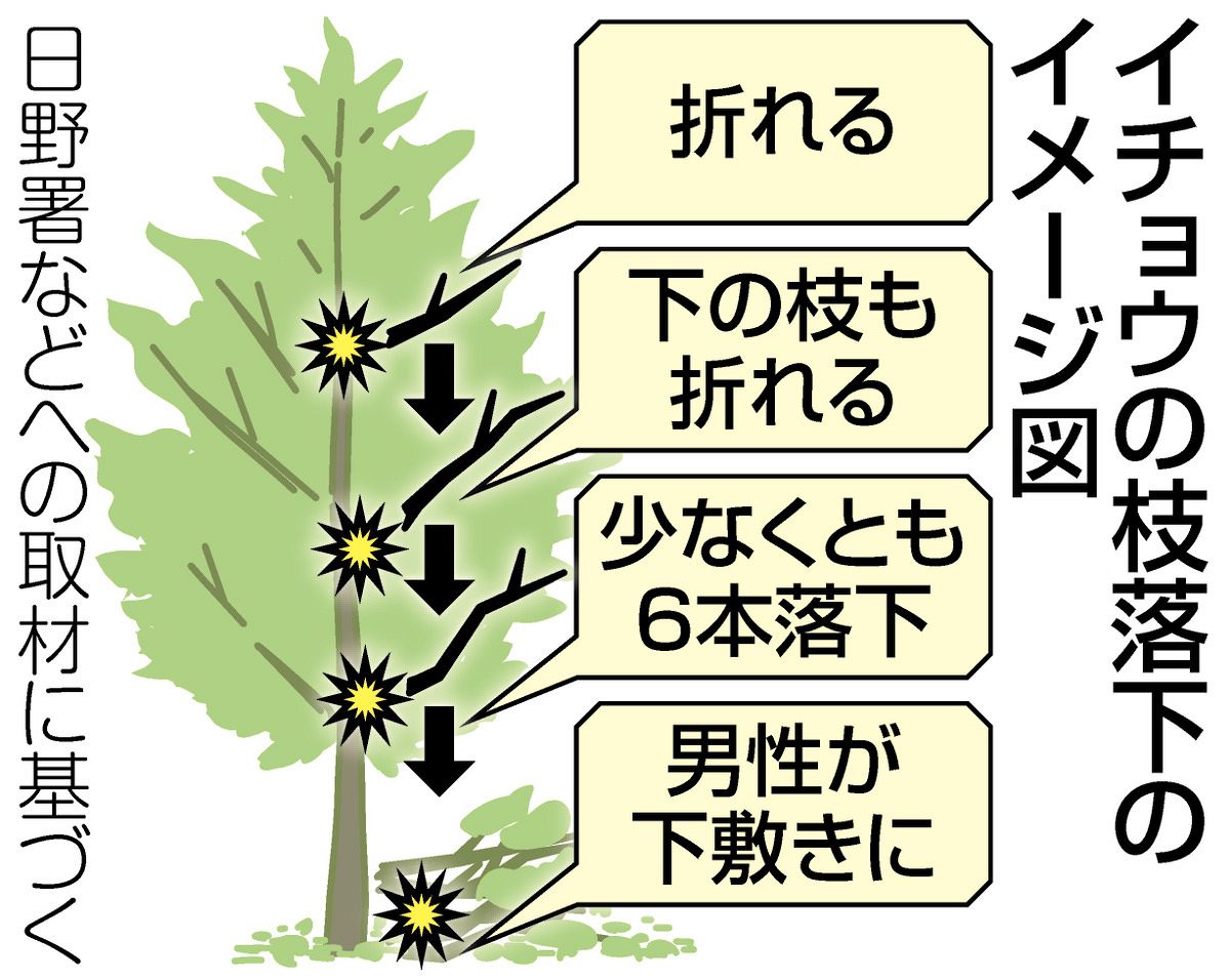 警視庁日野署によると、高さ10メートル超のイチョウの枝が上部で折れ、下方の枝を巻き込みながら落ち、少なくとも6本が落下した。最大で直径約30センチ、長さは約5メートルだった。現場はJR豊田駅の北700メートルで、市立中学校と団地の間にある市が管理する緑地。イチョウ並木の遊歩道で人が自由に出入りでき、男性は偶然通りかかったとみられる。署は枝が落ちた原因を調べている。