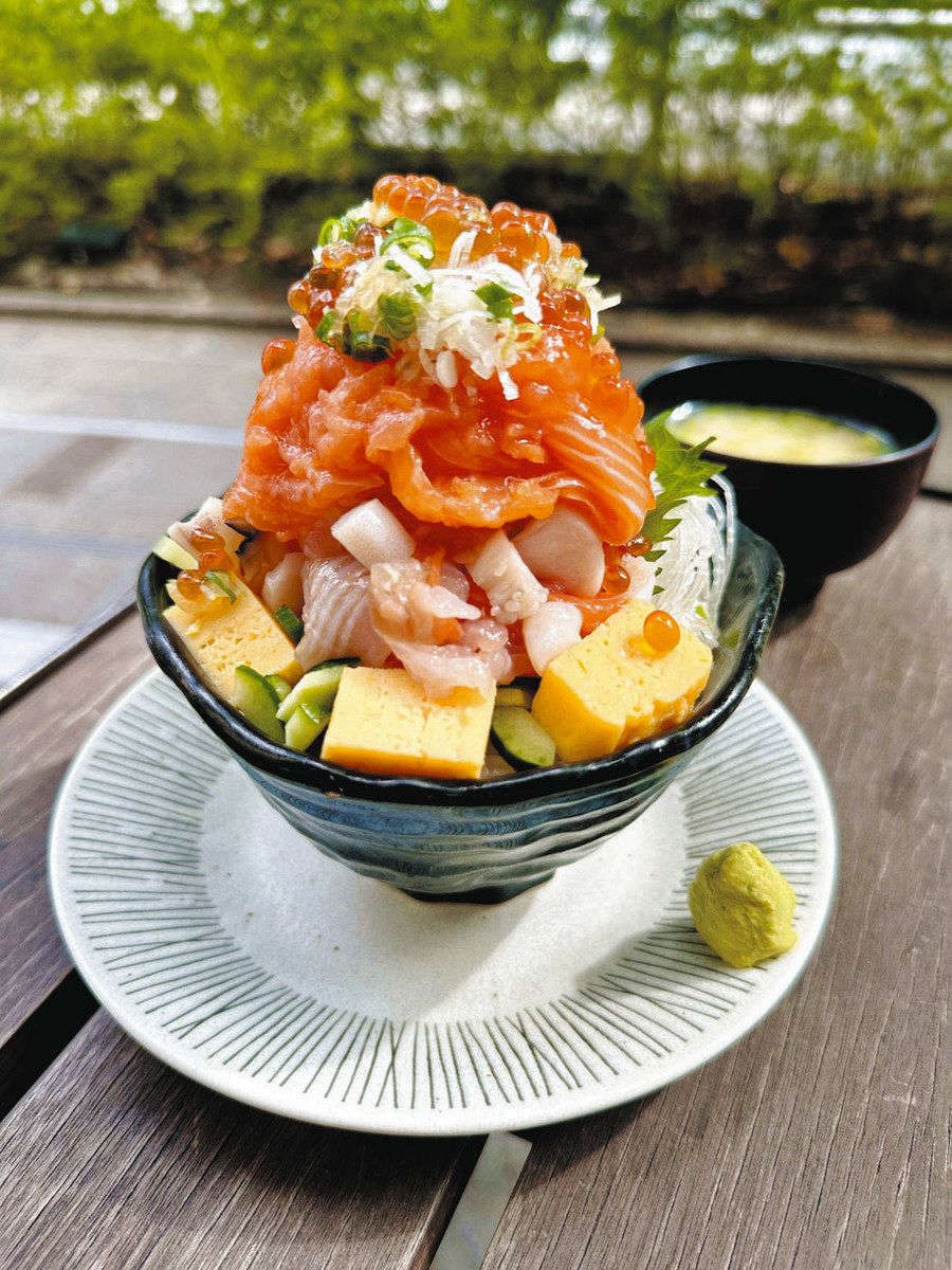 サーモン、マグロ、白身、ゲソなど10種類の海鮮をこんもりと盛り、「映え」を意識した見た目はインパクト十分。ねっとりとしてとろけるようなサーモンを中心に、キュイッ、シャキッとゲソやキュウリが食感で彩る。器は小さめなので楽勝かと思いきや、予想以上のボリュームだった。聞けば、シャリ250グラム、ネタ250グラムの計500グラムもあるという。男性でも食べ残す人がいるとか。