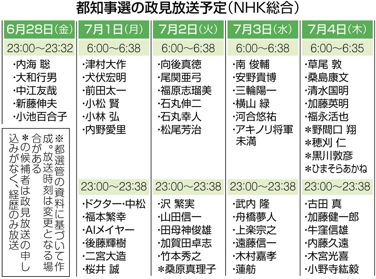 NHK総合では24日に放送が始まった。来月4日まで朝と夜の2回に分けて計51人分を放送する予定(6月29、30日は休み)。放送を希望しなかった5人は経歴のみ放送する。都選管資料から計算すると放送時間は計10時間46分となる。NHKによれば、候補者22人中20人の政見放送を行った前回選は計4時間18分。これを大幅に上回る見込みだ。