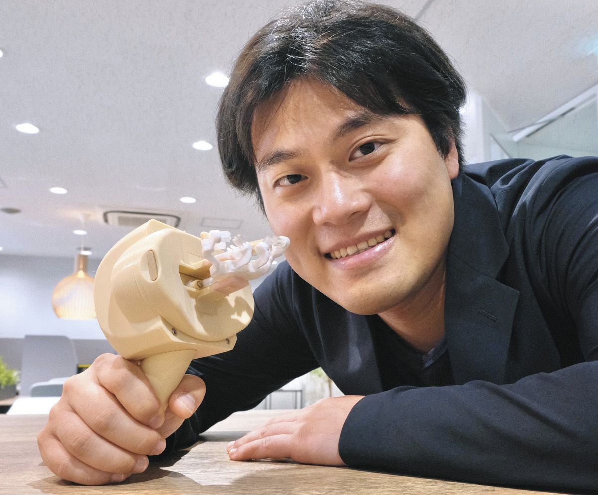開発した全自動歯ブラシを手にするGenics社長の栄田源さん=新宿区で