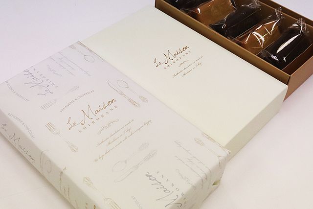 ライトグレーに金の箔押しがアクセントに映える、手土産にも喜ばれるフレンチテイストのパッケージ。