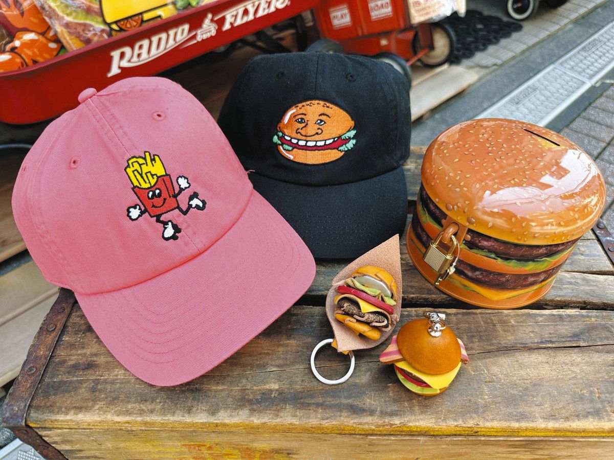 売れ筋1位は「if you wantとのコラボキャップ」(3800円)。「if you want」は目黒区にある古着などのセレクトショップで、経営者は永沼さんの友人。ハンバーガーやフライドポテトなどをキャラクター化して多色展開。頻繁に新作が登場し、コレクターもいる。2位は静岡県の革作家による「ジャンククリエイツの革バーガー」(2530円~)。キーホルダー、アクセサリー、財布などをそろえている。3位は「ビッグハンバーガーバンク」(1100円)。大手バーガーチェーンの版権を持っていたメーカーの貯金箱で、今ではあまり見かけない金属製がここで手に入る。