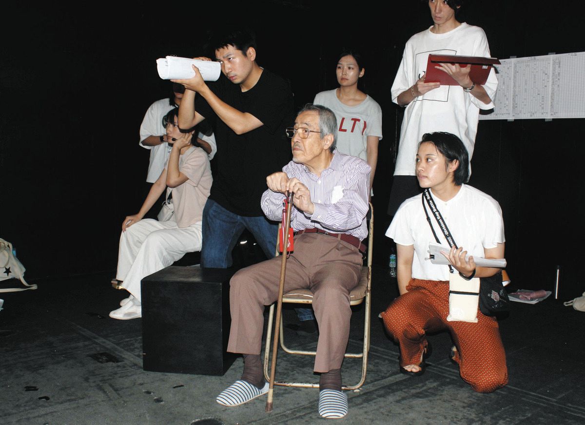 若い俳優たちとともに稽古に励む矢田稔さん(前列中央)=東京都杉並区で