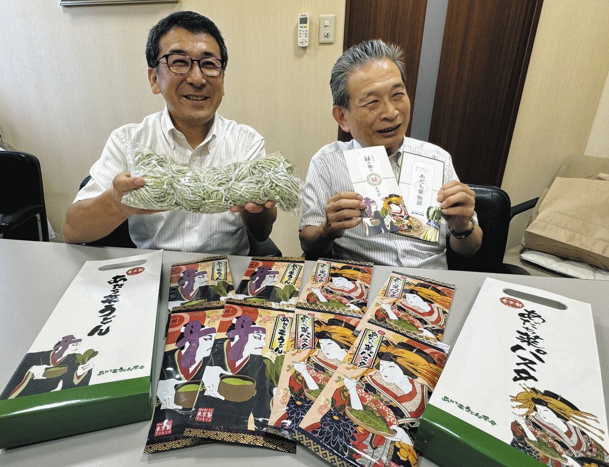 あだち菜うどんを手に「世界に羽ばたいてほしい」と願うNPO法人あだち菜うどん学会理事長の松山卓司さん(左)と初代理事長の渡井良昌さん=足立区で