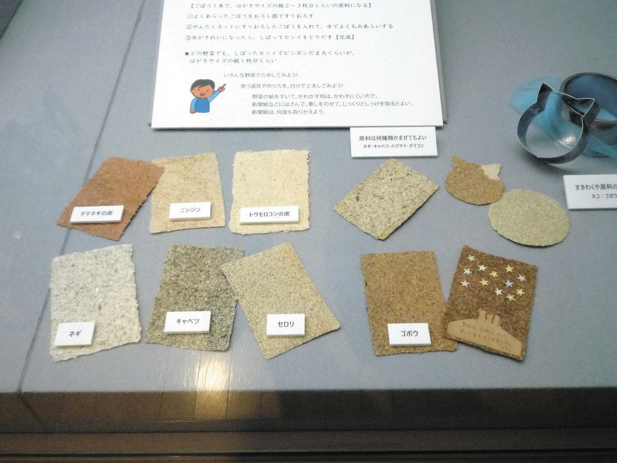 紙は木以外の植物からも作られる。野菜から繊維を取りだし、水とともに紙が作られる。実際に、長ネギから紙を作る体験イベントも行われた。