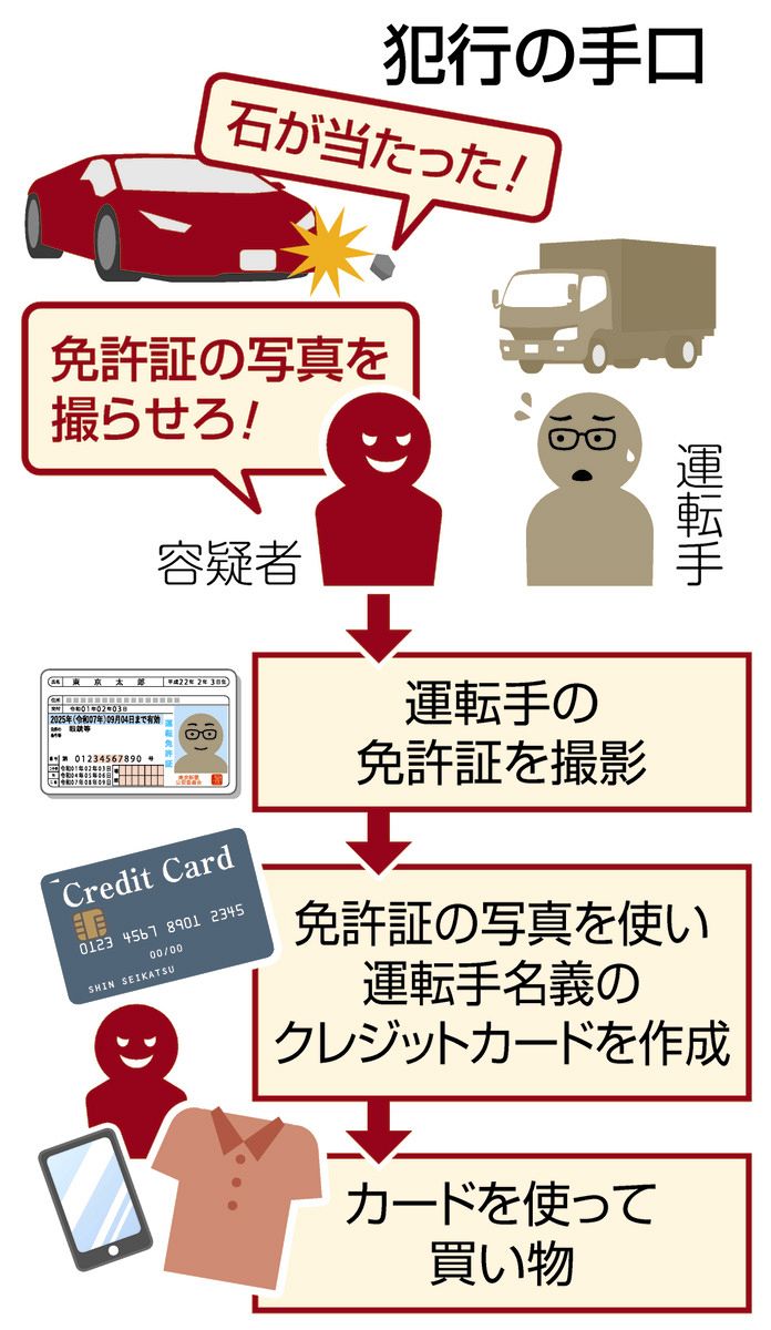 犯収課によると、3人は高級スポーツカーなどでトラックの後ろを走り、「飛び石で車が傷ついた」などと言いがかりをつけ、トラック運転手の免許証を撮影。画像をもとに他人名義のクレジットカードを不正に作成し、商品を購入したという。