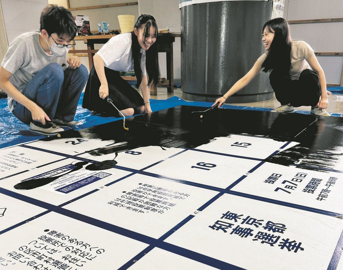 ブルーシートに大きな板を置き、黒ペンキで丁寧に塗りつぶしていく生徒ら。板はマス目で仕切られ、「ポスター掲示場」「東京都知事選挙」の文字が見える。ところどころ候補者のポスターも張られたままで、「人の顔にペンキを塗っちゃっていいのかな」という冗談も聞こえてきた。