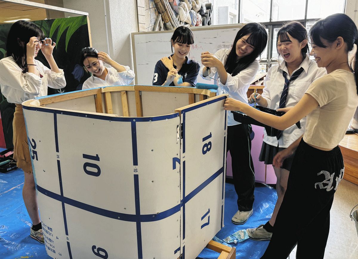 ポスター掲示板を使って文化祭の大道具を作る生徒たち