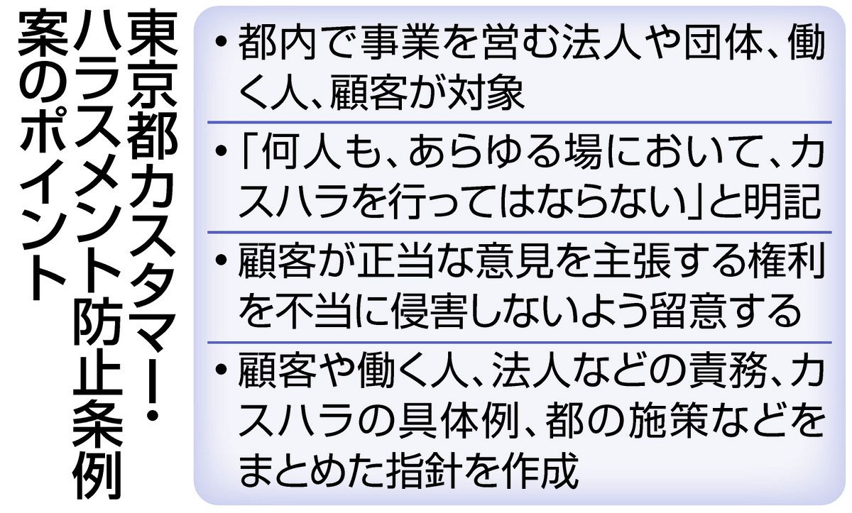 一方、客が正当な主張をためらわないよう「顧客の権利を不当に侵害しないように留意しなければいけない」とも定めた。都は施行までにガイドラインを作り、カスハラにあたる行為について具体例を明示する。