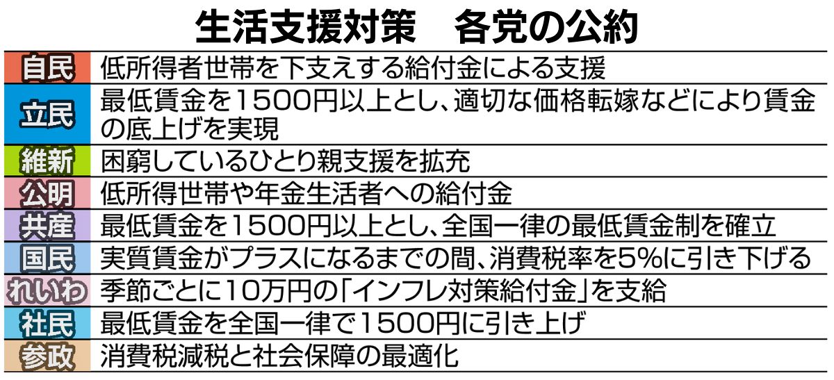 27日投開票の衆院選では、暮らしの安定に向け、自民党が「物価高の影響を特に受ける低所得世帯を下支えする給付金による支援」、立憲民主党が「最低賃金を1500円以上とし、適切な価格転嫁などにより賃金の底上げを実現」などの公約を掲げている。