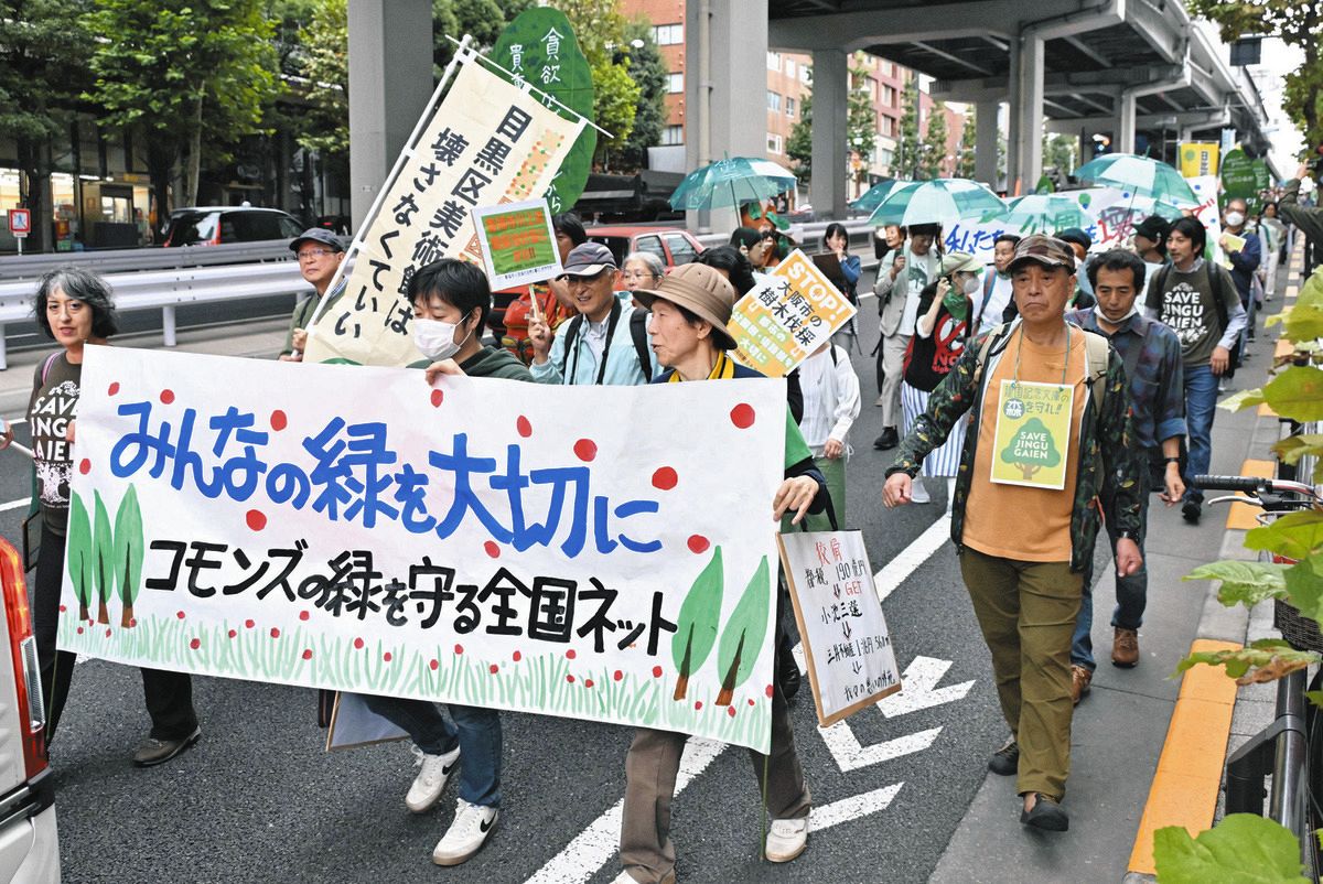 公園など公共空間の再開発に反対する住民団体の連絡組織「コモンズの緑を守る全国ネット(コモンズネット)」が主催。「外苑を守る!」などと書かれたボードを掲げ、神宮外苑から日比谷公園(千代田区)までの約5キロを行進した。