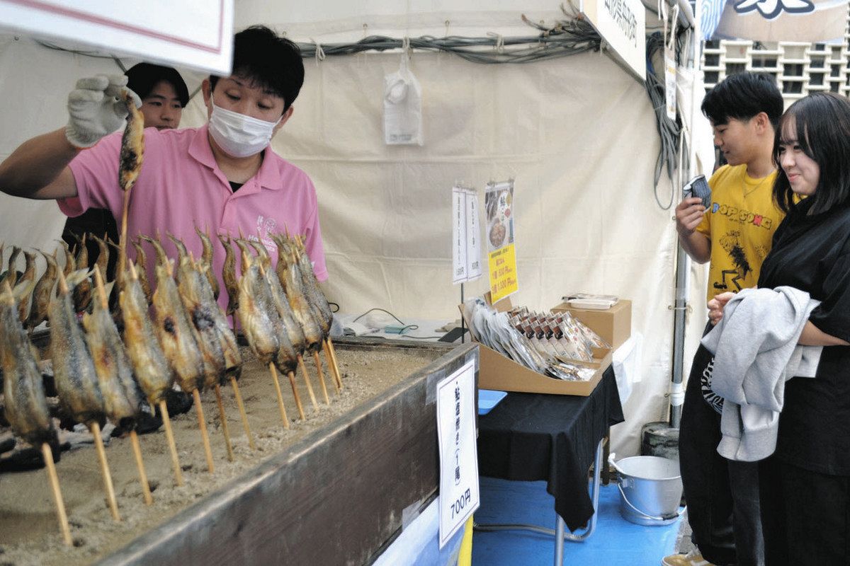 山形県舟形町が出したアユの塩焼きのブース=港区の新橋駅前で