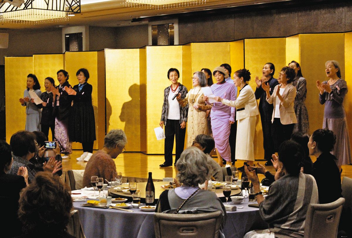 1日の同窓会では、食事を楽しみながら昔話に花を咲かせ、SKDの団歌「桜咲く国」「あこがれの星座」を合唱した。