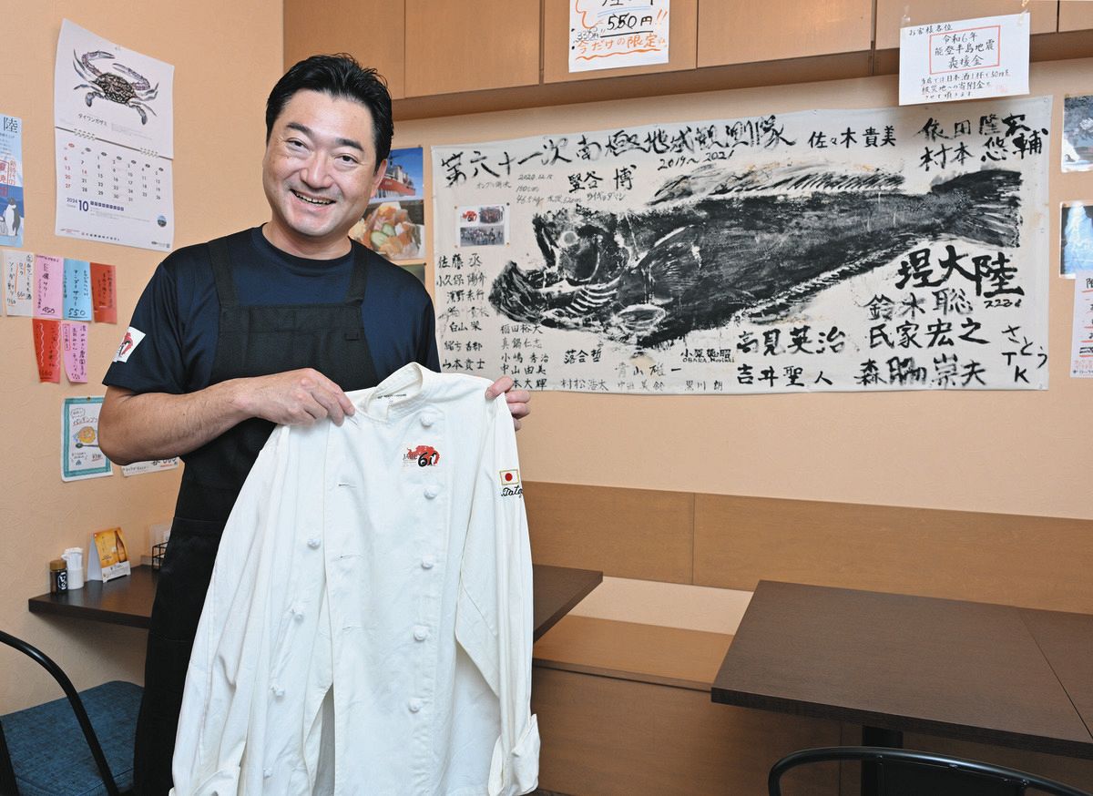 昭和基地で着ていたコックコートを手にする竪谷博さん。後方は南極で釣り上げたライギョダマシの魚拓=杉並区西荻北で
