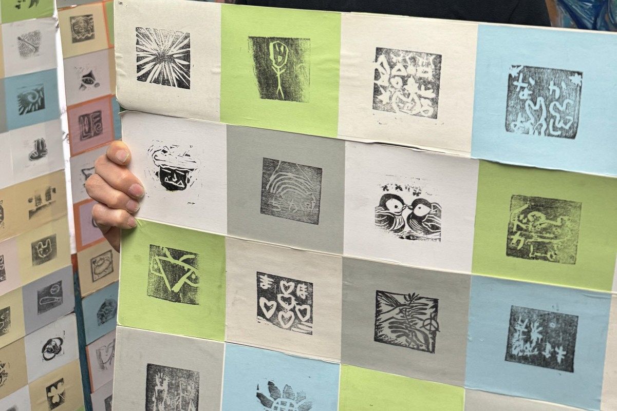 5センチ四方の小さな版画に、彫った人それぞれの平和への思いが込められている。一輪の花、ほおを寄せ合う母子、輝く太陽。「子どもたちには、自分たちが大切にしているものを表現してみようと伝えます。大切なものとともに日常を送れるのは、平和があってこそだから」